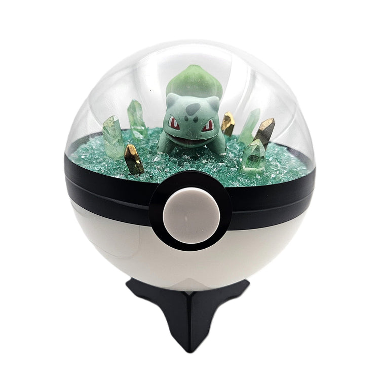Bring the magic of the Pokémon world into your home with our handcrafted Bulbasaur Terrarium. This enchanting piece is encased in a sleek, white Pokéball shell, revealing a glittering green interior.