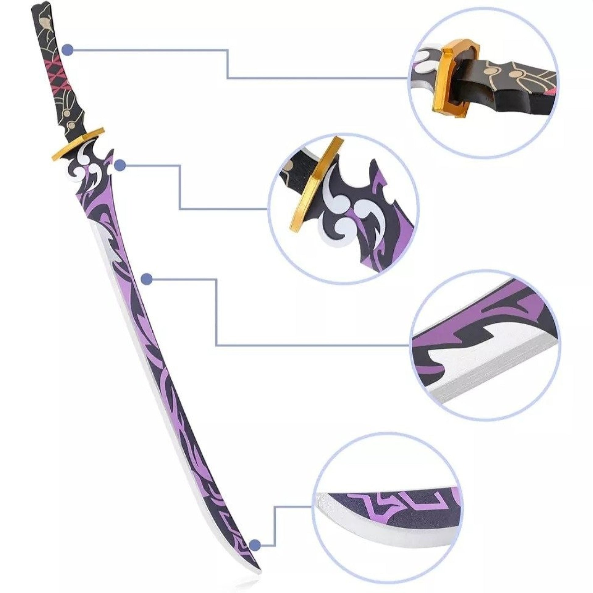 - Vibrant purple, black, and silver blade design with gold detailing