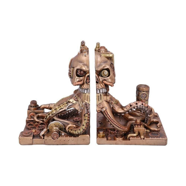 Split directly through the centre, the 2 halves of this automaton skull can be used to keep your favourite novels upright on any shelf. Below the cranium, a set of mechanically enhanced tenacles is attached, gripping to the metallic surface below.