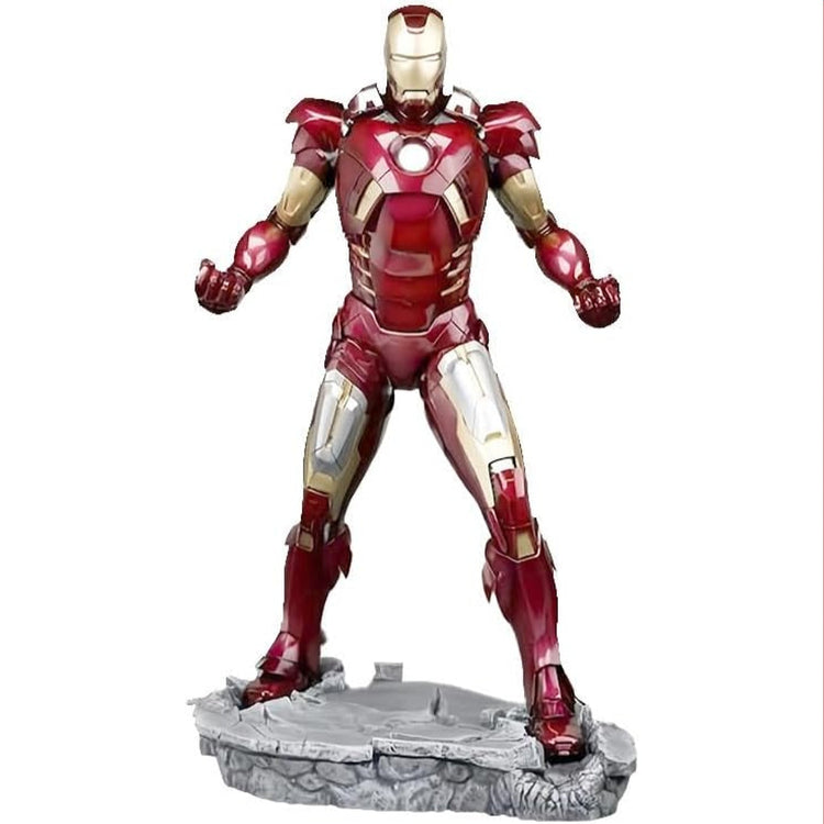 Standing tall at a commanding 32 centimetres, this meticulously crafted resin statue brings the formidable Iron Man Mark VII armour to life in stunning detail. The iconic red and gold colour scheme immediately captures the eye, with the deep, lustrous red panels contrasting sharply against the gleaming metallic gold accents that define the helmet's contours, the powerful shoulder pauldrons, intricate chest detailing, robust gauntlets, the suit's waist, and the segmented plating of the thighs and lower legs. The paint application is executed with precision, likely boasting a smooth, high-gloss finish that convincingly emulates the polished surface of Tony Stark's advanced technology.