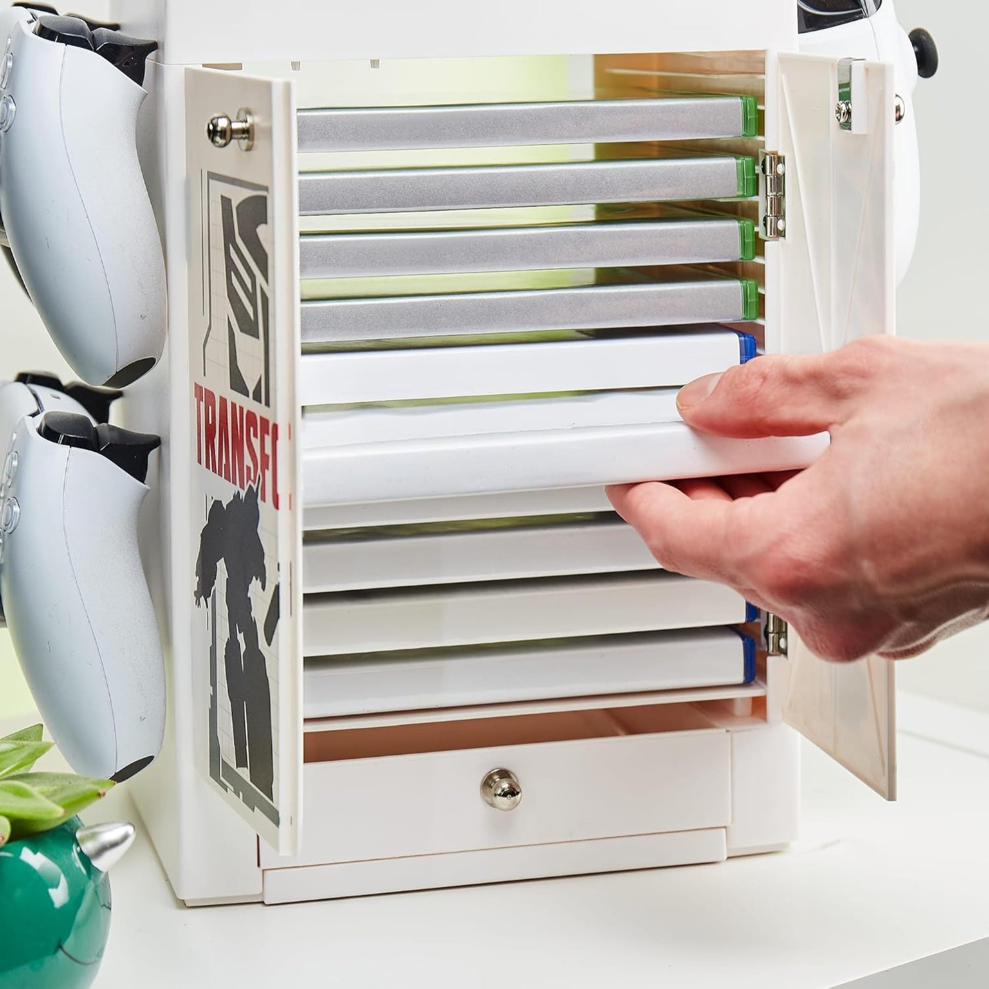 Transform your gaming space from untidy to tidy with this awesome Transformers gaming locker! Offering a storage solution for up to 10 of your favourite Xbox One/Xbox Series X|S games, PS4/PS5 games or movies, the locker also provides side mounts to 4 controllers, a headphone mount and the handy drawer in the base can holds accessories like cables & thumb grips.