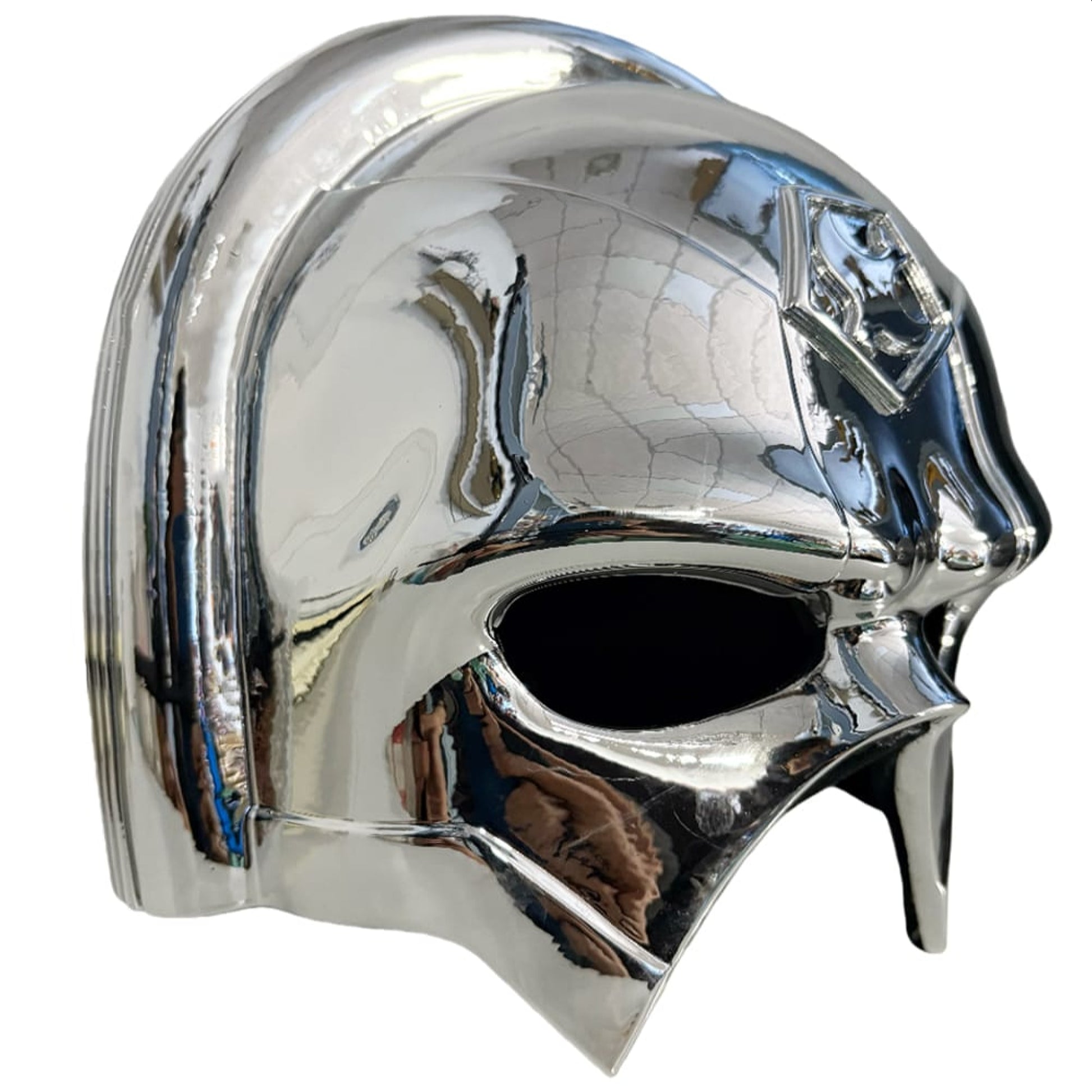 Carefully sculpted curves, clean lines, and a mirror-like chrome finish replicate Peacemaker’s iconic helmet with precision.