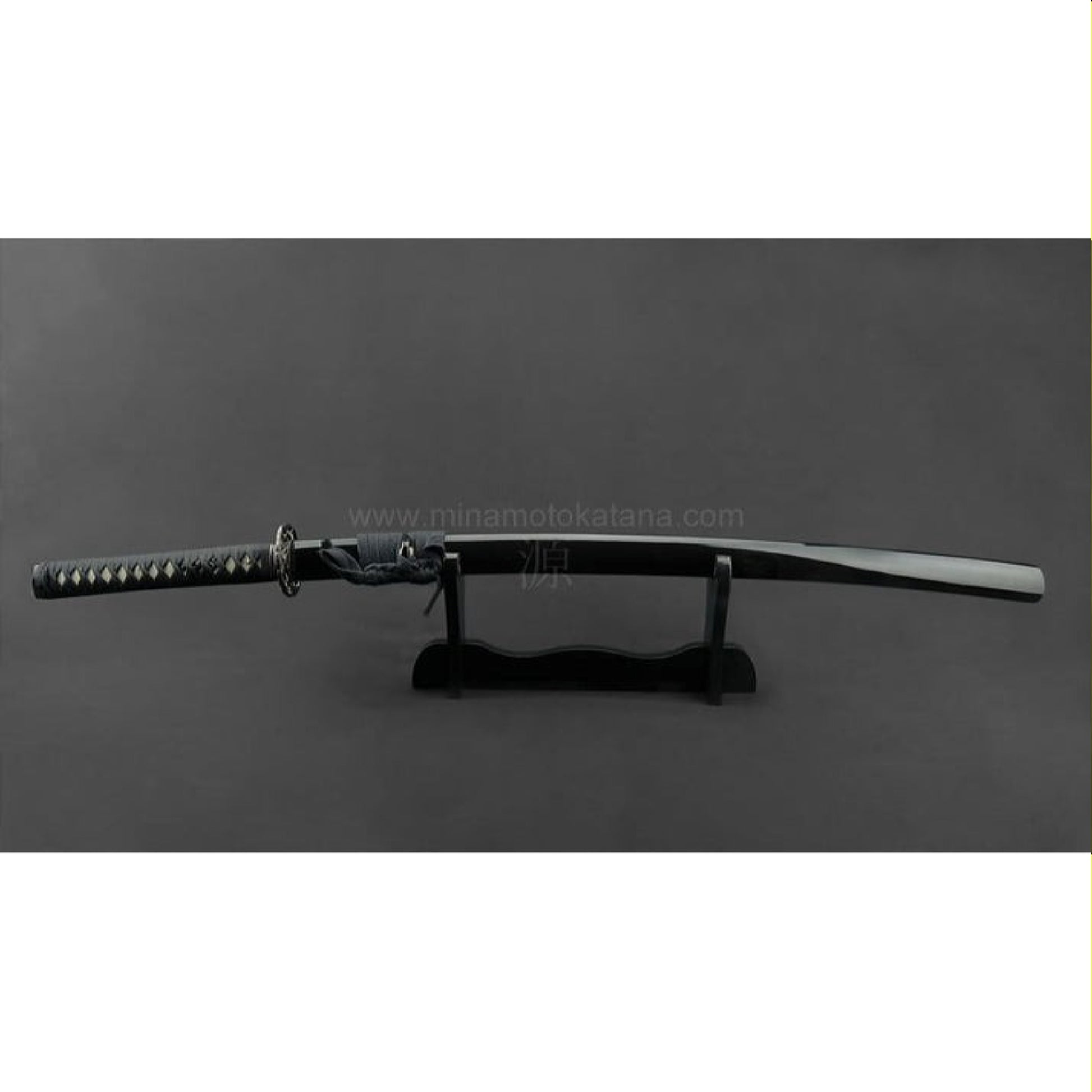 The wooden handle is wrapped in genuine Stingray skin (Samekawa) before the traditional cotton handle wrapping (Tsukamaki). The saya (sheath) fittings are wood. The sageo (or ‘ito’) – which is the material wrapped around the saya – is made of cotton. The wooden box, black sleeve, cleaning kit and stand are included.